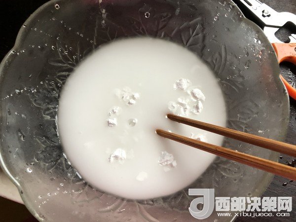 3.把土豆淀粉放入碗里,加入適量清水調(diào)勻后靜置30分鐘