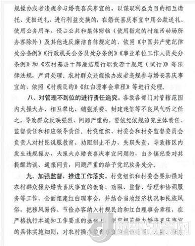 各級各部門對管轄范圍內(nèi)大操大辦、相互攀比、鋪張浪費、封建迷信等不良風(fēng)氣聽之任之,導(dǎo)致群眾反映強烈、問題嚴(yán)重的,要依紀(jì)依規(guī)追究主體責(zé)任、監(jiān)督責(zé)任和相應(yīng)領(lǐng)導(dǎo)責(zé)任。村黨組織、村委會和村務(wù)監(jiān)督委員會負責(zé)人對村民說服教育、勸阻制止不力,失職失責(zé),導(dǎo)致轄區(qū)內(nèi)發(fā)生違規(guī)操辦、大操大辦婚喪喜慶事宜問題的,由鄉(xiāng)鎮(zhèn)紀(jì)委對其提醒約談、通報問責(zé),問題嚴(yán)重的給予黨紀(jì)政務(wù)處分。
