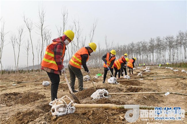 工人在河北雄安新區(qū)“千年秀林”工程施工現(xiàn)場施工(3月21日攝)。新華社記者 牟宇 攝