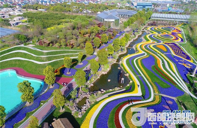 這是4月8日航拍的江蘇南通洲際綠博園花海景觀。