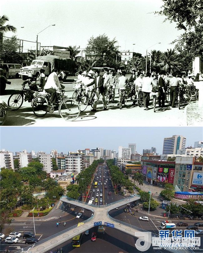 拼版照片為海口市海府路今昔對比(上圖為1988年12月新華社記者姜恩宇攝,下圖為2018年4月14日新華社記者郭程攝)。