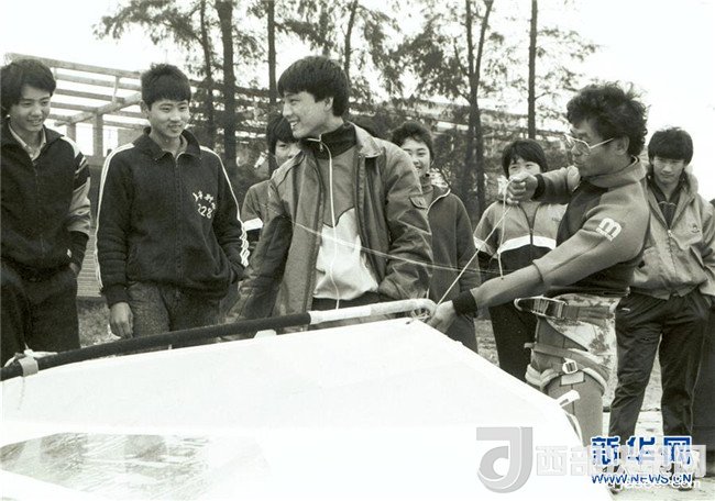 來自臺灣的帆板運動員在??诤彤?shù)厝罕娊涣鳎?989年1月16日攝)。新華社記者 姜恩宇 攝