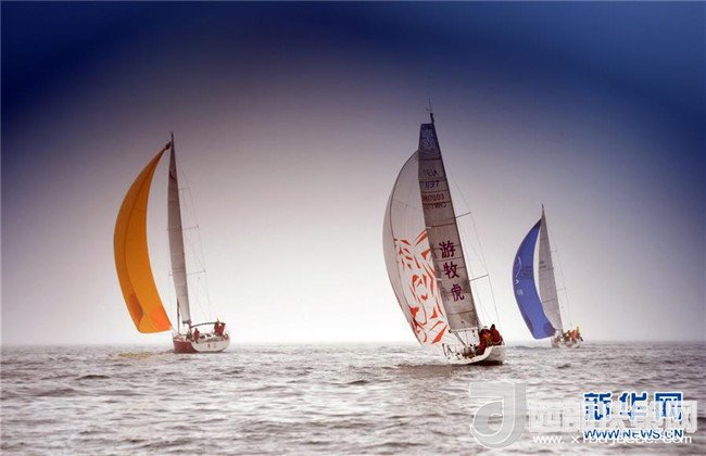 參賽賽船在2016年第七屆環(huán)海南島國際大帆船賽三亞-??诶惖谋荣愔校?016年3月14日攝)。新華社記者 楊冠宇 攝