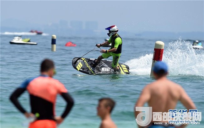 在三亞蜈支洲島參加2016動力沖浪板國際賽中國站的選手在比賽中(2016年9月17日攝)。新華社記者 楊冠宇 攝