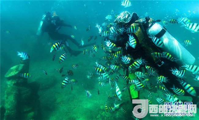 由教練帶領(lǐng)的潛水愛好者在海南省分界洲島附近海域下潛(2017年5月1日攝)。新華社發(fā)(童國強攝)