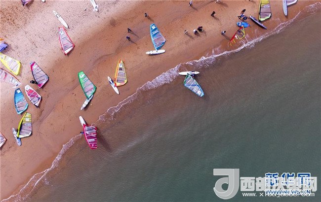 參加2017第四屆國際旅游島帆板大獎賽海口大獎賽的選手在比賽結(jié)束后上岸(2017年11月16日無人機拍攝)。新華社記者 楊冠宇 攝