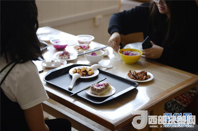 4月25日,兩名云南大學(xué)的研究生來到食堂體驗(yàn)“玫瑰宴”。新華社發(fā)