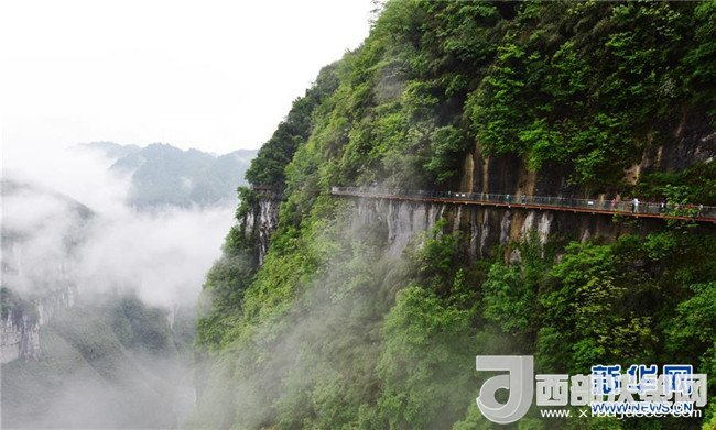 5月1日,游客在湖南省吉首市的懸崖棧道上游覽。當(dāng)日,吉首市雨過天晴,山區(qū)云霧縹緲,變幻多姿。新華社發(fā) 姚方 攝