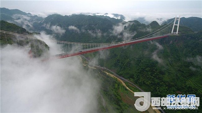 5月1日,湖南省吉首市矮寨大橋周邊云霧繚繞。當(dāng)日,吉首市雨過天晴,山區(qū)云霧縹緲,變幻多姿。新華社發(fā) 龍恩澤 攝