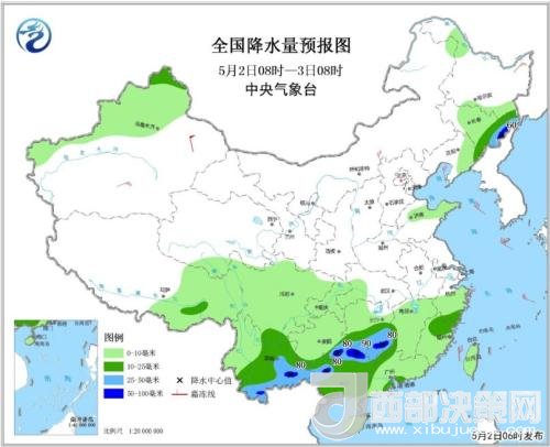 5月2日08時至3日08時,吉林東部、湖南南部、貴州南部、廣西大部、云南南部等地的部分地區(qū)有中到大雨,其中,吉林東部、湖南南部、貴州東南部、廣西北部和西部、云南南部等地局地有暴雨(50~90毫米);上述局部地區(qū)將伴有短時強降水等強對流天氣。新疆北部和南疆盆地東部、內(nèi)蒙古中西部、遼東半島等地有4~6級風(fēng);新疆南疆盆地等地的部分地區(qū)有揚沙或浮塵天氣(見圖1)。