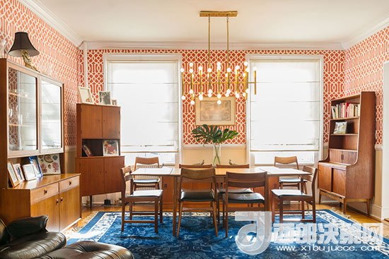 餐廳墻面用橙色為底、帶白色幾何紋理的壁紙來鋪貼,暖色系空間更能刺激人的食欲,鋪設(shè)藍(lán)色地毯既在空間中形成了色彩碰撞,又是與客廳色調(diào)的呼應(yīng)。