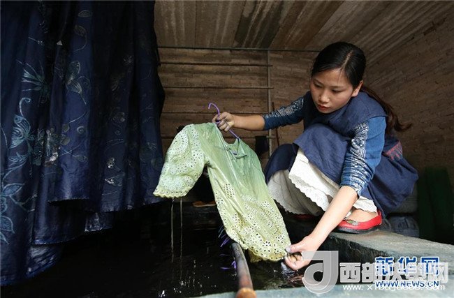 5月2日,在貴州省丹寨縣,張義蘋在染房?jī)?nèi)查看蠟染產(chǎn)品的染色效果。