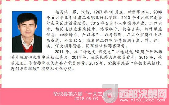 西部決策網(wǎng)——西部大開發(fā)訊(帥華鋒 張曉紅 通訊員 陳彥榮 柴金霞)5月3日,在南梁法官教育基地講法堂,華池團縣委隆重召開紀(jì)念“五四”運動99周年暨第六屆“十大杰出青年”表彰大會。甘肅南梁革命紀(jì)念館趙高銪同志榮獲華池縣第六屆“十大杰出青年”榮譽稱號。