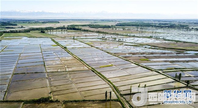 在新疆察布查爾錫伯自治縣扎庫齊牛錄鄉(xiāng)拍攝的一處水稻田(5月21日無人機拍攝)。近日,隨著氣溫漸高,地處新疆伊犁河谷的察布查爾錫伯自治縣迎來插秧高峰期,田間地頭一派繁忙景象。塊塊稻田水滿如鏡,田間防護林枝繁葉茂,遠處雪山依稀可見,如一幅在大地上鋪展開的生態(tài)畫卷。新華社記者胡虎虎攝