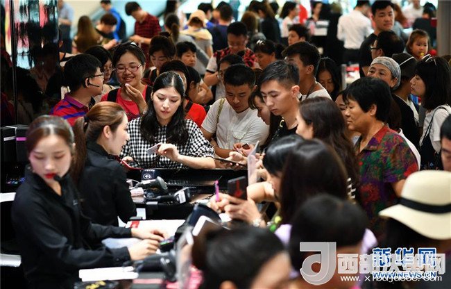 顧客在海南三亞海棠灣免稅店內(nèi)的一家化妝品店排隊(duì)付款(2月18日攝)。