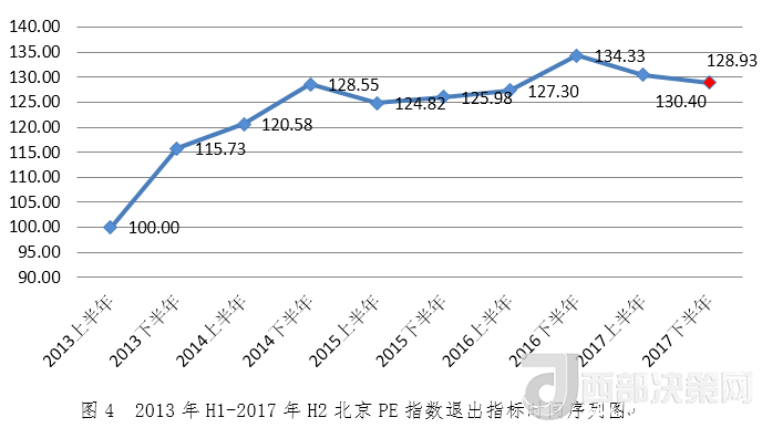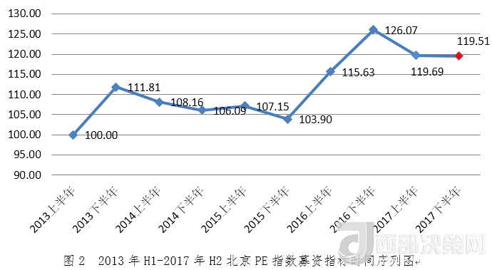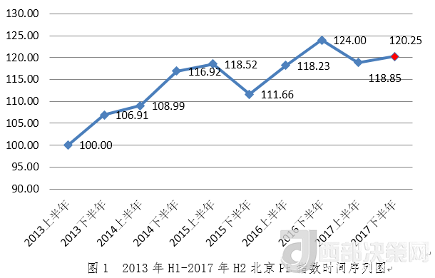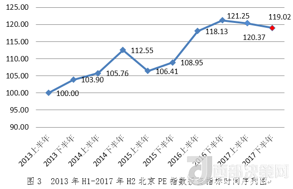 2017年下半年北京PE指數(shù)為120.25,環(huán)比增長(zhǎng)1.18%,同比下降3.03%。從指數(shù)走勢(shì)看,2017年下半年北京PE指數(shù)較上半年穩(wěn)步回升,仍處于高位。