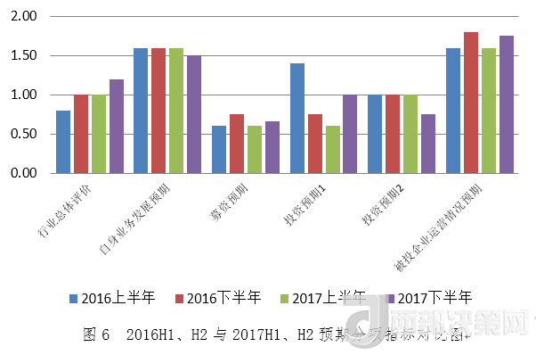 從指數(shù)分項(xiàng)指標(biāo)看,2017年下半年募資指標(biāo)為119.51,環(huán)比下降0.15%;投資指標(biāo)為119.02,環(huán)比下降1.12%;退出指標(biāo)為128.93,環(huán)比下降1.13%;信心指標(biāo)為119.83,環(huán)比上升6.99%。