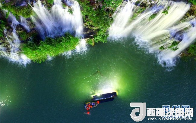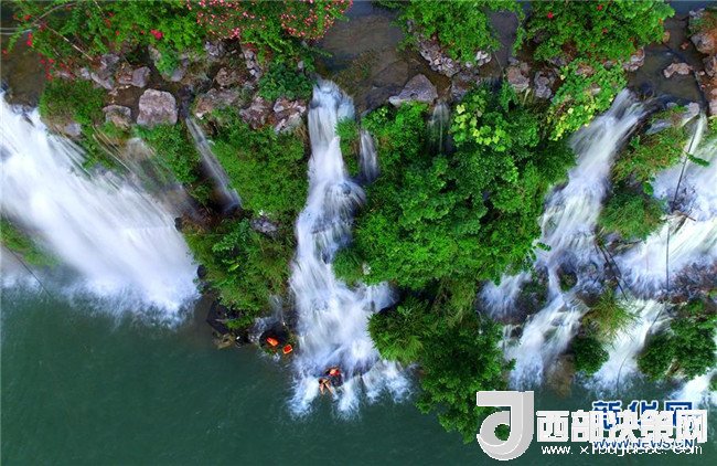 7月18日,市民在廣西柳州市蟠龍山瀑布群下戲水消暑(無(wú)人機(jī)拍攝)。
