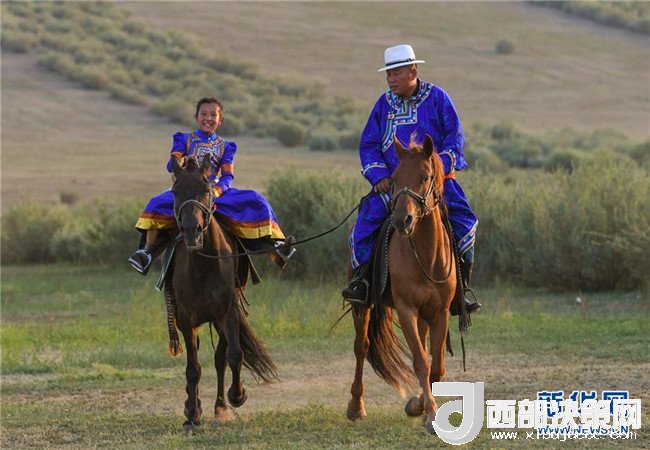 夕陽下,呼日查畢力格在教女兒騎馬(7月20日攝)。新華社記者彭源攝