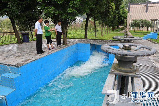 2018年7月15日,貴州興義市桔山河市級(jí)河長(zhǎng)葛佳華(中)、鎮(zhèn)級(jí)河長(zhǎng)陳再云(左)和村級(jí)河長(zhǎng)陳明君在桔山污水處理廠的出水口進(jìn)行巡查。新華社記者 歐東衢 攝