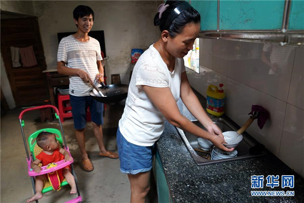 9月4日,在黃文春家中,黃文春和妻子歐陽(yáng)沙在廚房做飯。黃文春2011年與同學(xué)歐陽(yáng)沙結(jié)婚后,就把根扎在了蘆嶺,幾次放棄了考試進(jìn)城教書(shū)的機(jī)會(huì)。 新華社記者 宋振平 攝