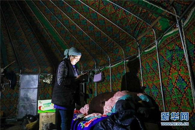 在青河縣查干郭勒鄉(xiāng)薩爾布拉克村,胡賽因·哈力都拉的妻子巴提古麗·朱馬江在氈房里準備給手機充電(8月25日攝)。新華社記者江文耀攝