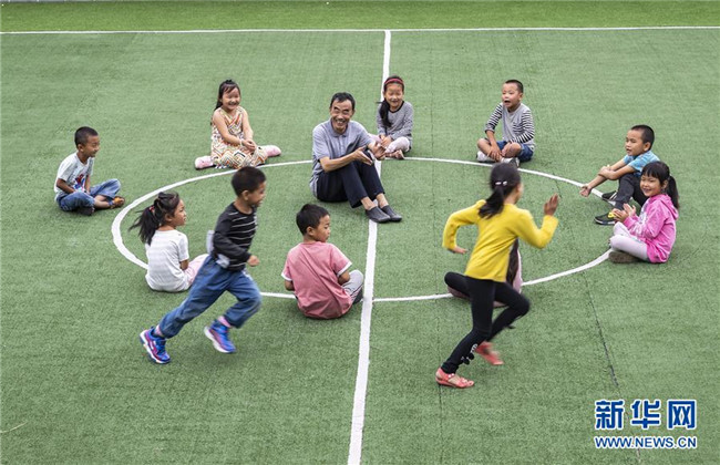9月6日,在重慶市南川區(qū)大有鎮(zhèn)水源村僑心小學(xué),教師江開華和孩子們一起玩游戲。新華社發(fā)(瞿明斌攝)