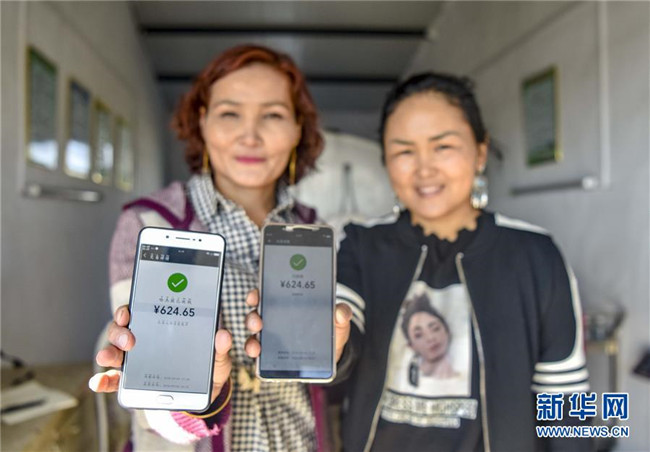 合作社工作人員沙吾麗(左)通過微信向員工轉(zhuǎn)賬駝奶的銷售收入(9月14日攝)。 新華社記者 趙戈 攝
