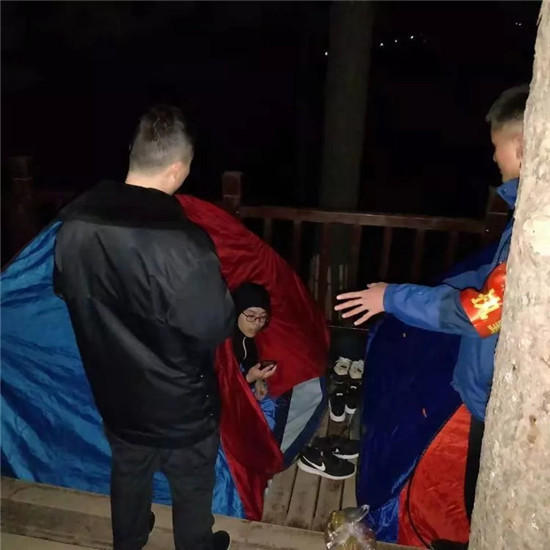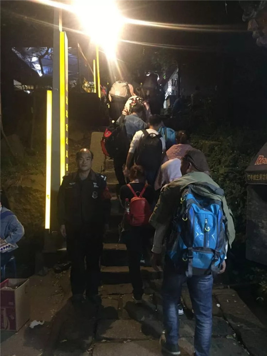 深夜執(zhí)勤人員堅(jiān)守崗位維護(hù)游覽秩序、主峰區(qū)執(zhí)勤人員勸阻游客遠(yuǎn)離危險(xiǎn)地帶,注意夜晚游覽安全