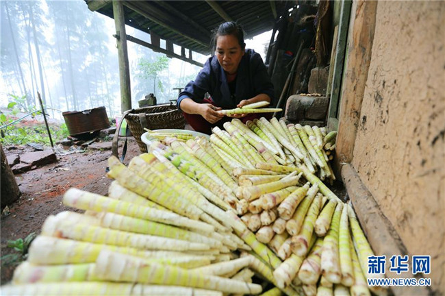 10月14日,在貴州赤水市寶源鄉(xiāng)聯(lián)華村,竹農(nóng)加工剛?cè)さ孽r筍。金秋時(shí)節(jié),貴州省赤水市寶源、兩河口、丙安等鄉(xiāng)鎮(zhèn)種植的5萬(wàn)余畝大竹筍迎來(lái)收獲季。當(dāng)?shù)刂褶r(nóng)加緊采挖竹筍,進(jìn)行加工后外銷。素有“中國(guó)竹子之鄉(xiāng)”的赤水市,現(xiàn)有竹林面積132.8萬(wàn)畝。竹產(chǎn)業(yè)已經(jīng)成為當(dāng)?shù)孛撠氃鍪盏闹饕乐弧?(王長(zhǎng)育 攝)
