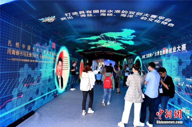 10月13日,第四屆中國“互聯(lián)網(wǎng)+”大學(xué)生創(chuàng)新創(chuàng)業(yè)大賽總決賽在廈門大學(xué)舉行。本屆大賽于今年3月份啟動(dòng),迄今累計(jì)已有近265萬大學(xué)生、63萬個(gè)團(tuán)隊(duì)參賽,涌現(xiàn)出一大批科技含量高、市場(chǎng)潛力大、社會(huì)效益好的高質(zhì)量項(xiàng)目,以“90后”為主的創(chuàng)新創(chuàng)業(yè)生力軍已全面發(fā)力,釋放出“青年+創(chuàng)新創(chuàng)業(yè)”的無窮力量。圖為創(chuàng)新隧道亮相廈大校園。中新社記者 王東明 攝