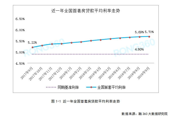 融360監(jiān)測(cè)數(shù)據(jù)顯示,2018年9月全國(guó)首套房貸款平均利率為5.70%,環(huán)比小幅上升0.18%,同比去年9月5.22%的利率上升9.20%。