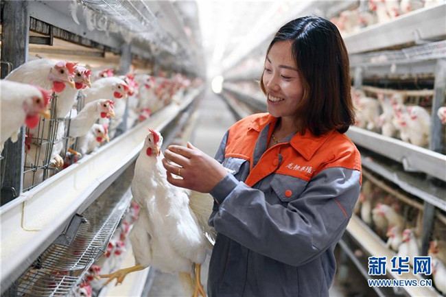 云南省鎮(zhèn)雄縣五德鎮(zhèn)渡船壩社區(qū)農(nóng)家女劉艷外出務(wù)工多年后返鄉(xiāng)創(chuàng)業(yè),帶動鄉(xiāng)親們發(fā)展山地生態(tài)雞和優(yōu)質(zhì)蛋雞養(yǎng)殖增收脫貧。這是劉艷在養(yǎng)殖場查看優(yōu)質(zhì)蛋雞(6月4日攝)。新華社記者 楊宗友 攝