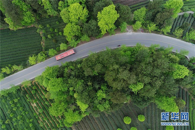 汽車在貴州省遵義市湄潭縣金花村內(nèi)的道路上行駛(4月12日無人機(jī)拍攝)。 新華社記者 歐東衢 攝