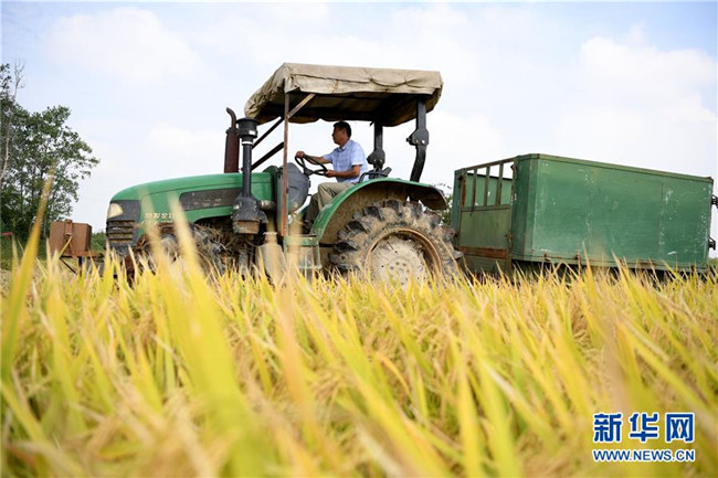 安徽省肥西縣山南鎮(zhèn)小井莊村種糧大戶陳良玉駕駛拖拉機(jī)運(yùn)送剛收割的水稻(9月12日攝)。 新華社記者 劉軍喜 攝