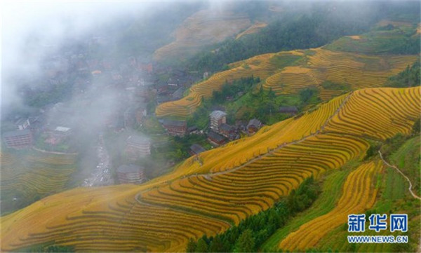 10月16日,游客在秋雨中欣賞龍脊梯田秋色(無(wú)人機(jī)拍攝)。金秋時(shí)節(jié),廣西龍勝各族自治縣龍脊梯田美如畫卷。 新華社記者 黃孝邦 攝