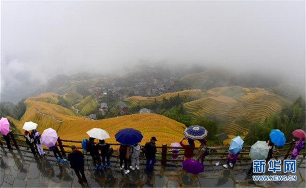10月16日,游客在秋雨中欣賞龍脊梯田秋色。金秋時(shí)節(jié),廣西龍勝各族自治縣龍脊梯田美如畫卷。 新華社記者 黃孝邦 攝