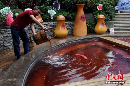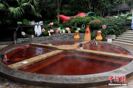 10月18日,市民正在泡“火鍋”溫泉。重慶一溫泉近期推出“奇妙的紅湯池”,直徑6.7米的圓形湯池被改造成一口4格“鐵鍋”,配上紅色的溫泉,如同巨型麻辣火鍋。“火鍋”溫泉湯池里的“火鍋底料”是用雞血藤、艾葉、紅花、首烏等中藥材加上紅酒熬制而成,對(duì)人體有一定保健功能。湯池周邊還陳列著鹽罐、油碟、午餐肉、啤酒瓶等裝置,水上漂浮著辣椒道具共同營造出麻辣火鍋的濃烈氣氛。 中新社記者 周毅 攝