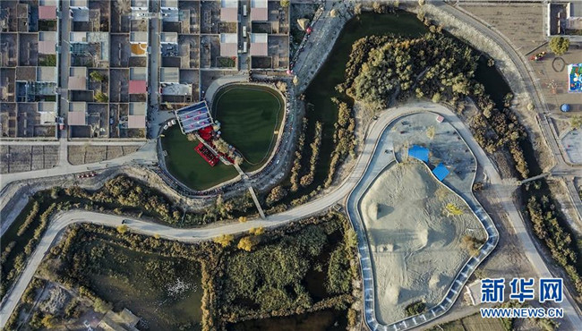新疆巴楚縣阿納庫勒鄉(xiāng)果勒買里村濱河體育文化公園(10月22日無人機(jī)拍攝)。 新疆巴楚縣阿納庫勒鄉(xiāng)果勒買里村緊鄰巴楚縣城,區(qū)位優(yōu)勢(shì)明顯。近年來,新疆維吾爾自治區(qū)體育局“訪民情”“惠民生”“聚民心”駐村工作隊(duì)幫助村里完善基礎(chǔ)設(shè)施和改善村容村貌,借助節(jié)慶活動(dòng)大力發(fā)展鄉(xiāng)村旅游,吸引周邊及外地游客前來觀光休閑,既豐富了村民的文化生活,又為村民增收致富拓寬了門路。 新華社記者 胡虎虎 攝