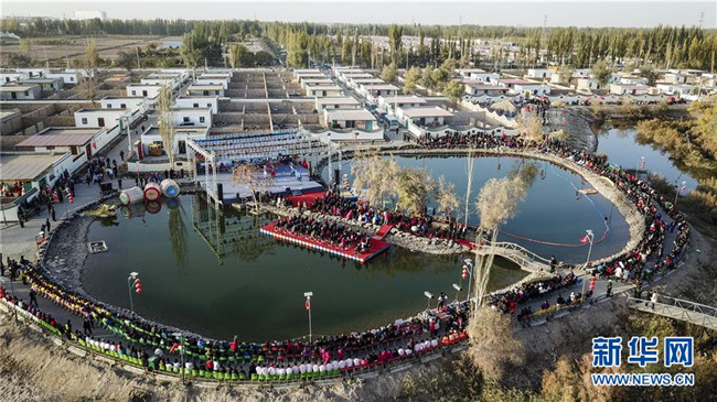 10月22日,在果勒買里村,游客和村民在觀看演出(無人機(jī)拍攝)。 新疆巴楚縣阿納庫勒鄉(xiāng)果勒買里村緊鄰巴楚縣城,區(qū)位優(yōu)勢(shì)明顯。近年來,新疆維吾爾自治區(qū)體育局“訪民情”“惠民生”“聚民心”駐村工作隊(duì)幫助村里完善基礎(chǔ)設(shè)施和改善村容村貌,借助節(jié)慶活動(dòng)大力發(fā)展鄉(xiāng)村旅游,吸引周邊及外地游客前來觀光休閑,既豐富了村民的文化生活,又為村民增收致富拓寬了門路。 新華社記者 胡虎虎 攝