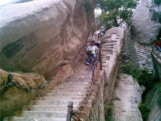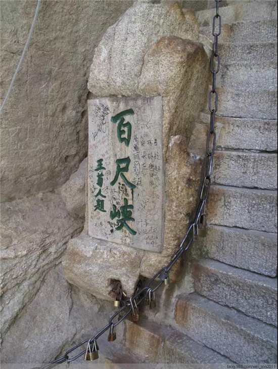 “千尺幢”在華山峪古道“回心石”上,是經(jīng)華山峪登主峰的必經(jīng)之道。這里原為一崖間裂隙,直立70度,后來人們沿隙鑿拓成路,有石階370級,階寬僅容半足,游人登臨時,仰視一線天,俯視若臨深井。