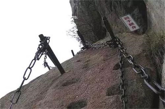 在南天門外,是華山著名險道之首“長空棧道”。棧道路分三段,出南天門石坊至朝元洞西,路依崖鑿出,長20米,寬二尺許,是上段;折向下行,在崖隙間橫貫有鐵棍,形如凌空懸梯,游人須挽索逐級而下,稱之“雞下架”,是中段;西折為下段,筑路者在峭壁上鑿出石孔,楔進石樁,石樁之間架木椽三根,游人至此,面壁貼腹,腳踏木椽橫向移動前行。這里只是探險之道,并非登山必由之路,膽小的游客觀望一下即可,體力和膽量沒有把握則不要輕易冒險。所以石刻上不少警告之語,如“懸崖勒馬”等。