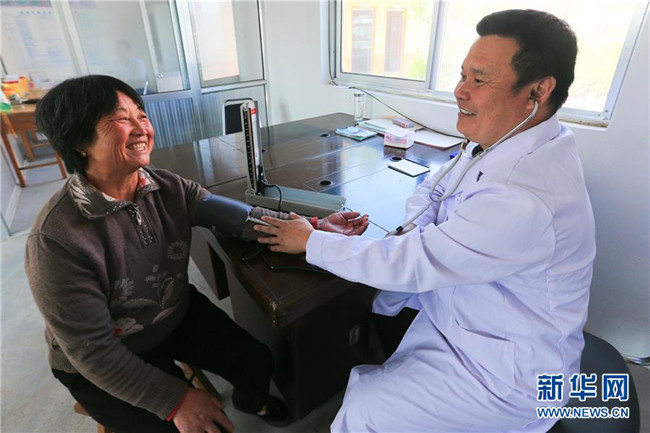 在山東蒙陰縣云夢(mèng)湖生態(tài)區(qū)東汶社區(qū)的農(nóng)村幸福院養(yǎng)老院的醫(yī)務(wù)室,醫(yī)生為老人測(cè)量血壓(10月11日攝)。2016年,東汶社區(qū)將原來的村兩委大院擴(kuò)建為農(nóng)村幸福院養(yǎng)老院,委派專人負(fù)責(zé)老人們的一日三餐。同時(shí)按照“子女交納、集體補(bǔ)助、社會(huì)捐贈(zèng)、財(cái)政獎(jiǎng)勵(lì)”的模式設(shè)立孝心養(yǎng)老基金,每月定時(shí)發(fā)給貧困老人。新華社記者 王南 攝