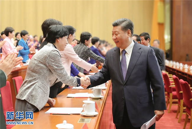 10月30日,中國(guó)婦女第十二次全國(guó)代表大會(huì)在北京人民大會(huì)堂開(kāi)幕。這是中共中央總書(shū)記、國(guó)家主席、中央軍委主席習(xí)近平等同與會(huì)代表親切握手。 新華社記者 鞠鵬 攝