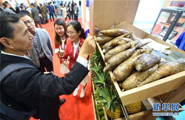 11月6日,參會(huì)者在首屆中國國際進(jìn)口博覽會(huì)多米尼加展區(qū)觀看展出的農(nóng)產(chǎn)品。新華社記者韓瑜慶攝