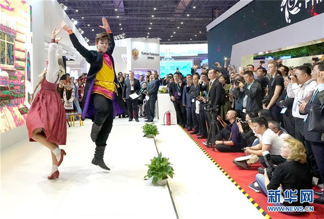 11月6日,俄羅斯演員在首屆中國國際進(jìn)口博覽會(huì)俄羅斯展區(qū)表演舞蹈。新華社記者陳建力攝