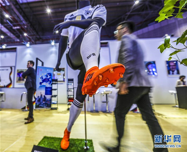 11月6日,參觀者從首屆中國國際進(jìn)口博覽會(huì)德國展區(qū)的德國足球國家隊(duì)2018年球衣展品旁走過。新華社記者殷剛攝
