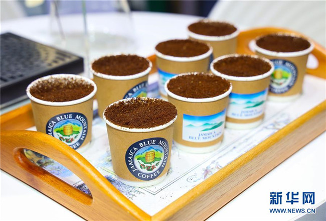 這是首屆中國國際進(jìn)口博覽會(huì)加勒比地區(qū)國家展區(qū)牙買加展臺(tái)展出的藍(lán)山咖啡(11月6日攝)。新華社記者劉大偉攝