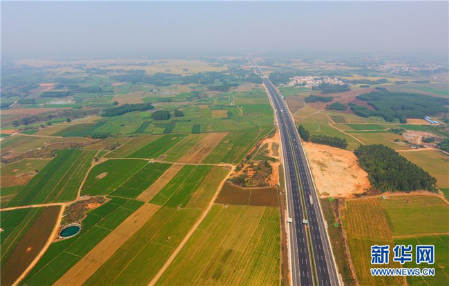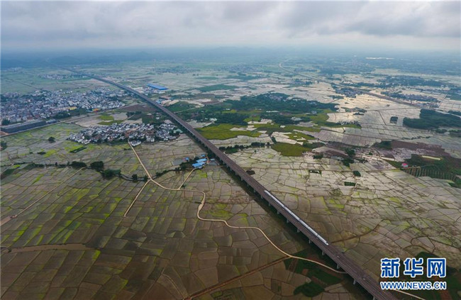 動(dòng)車在廣西南寧市的田野上行駛(2017年7月15日無人機(jī)拍攝)。
