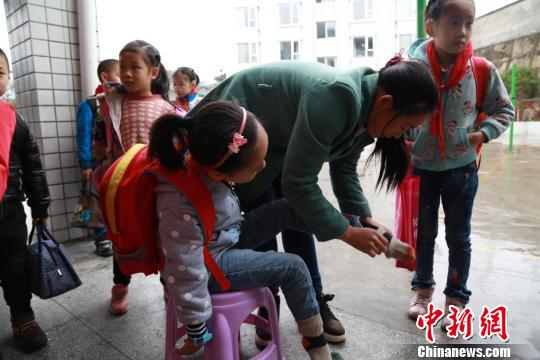 放學(xué)后,游成雪穿上襪子準(zhǔn)備回家。陳本強(qiáng) 攝